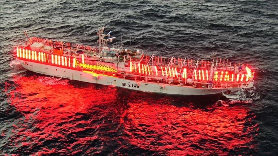 2. 在選定作業地點後,就開啟全船集魚燈,並以強力探照燈對著海面由外向內掃描,來誘導魚群游向船邊。